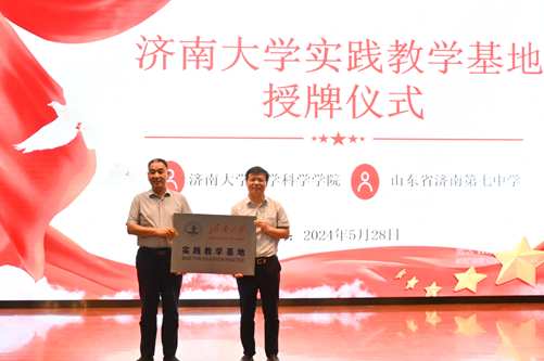 在济南第七中学报告厅举行了实践教学基地揭牌仪式。济南第七中学校长刘汉路、办公室主任李静、数学组教研组长程凤霞、漫画腐