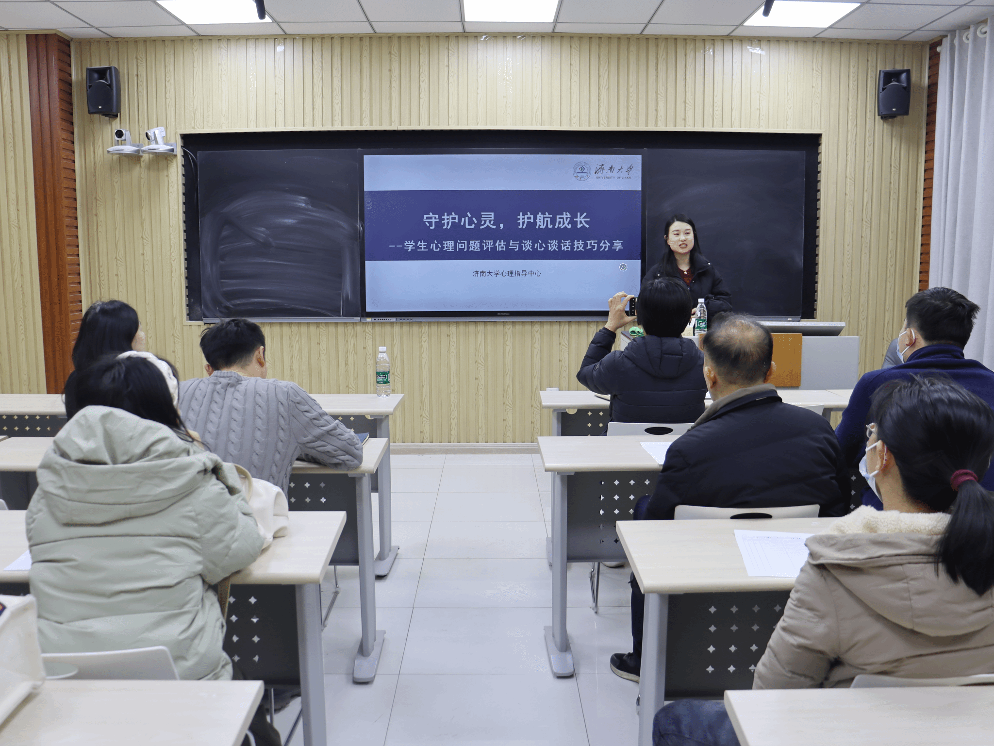 心理指导中心主任蔺琦琦做《学生心理问题评估及谈心谈话技巧分享》专题报告,学院党委书记崔英静,学院党委副书记、副院长张沂红,全体班主任及辅导员老师参加本次会议。