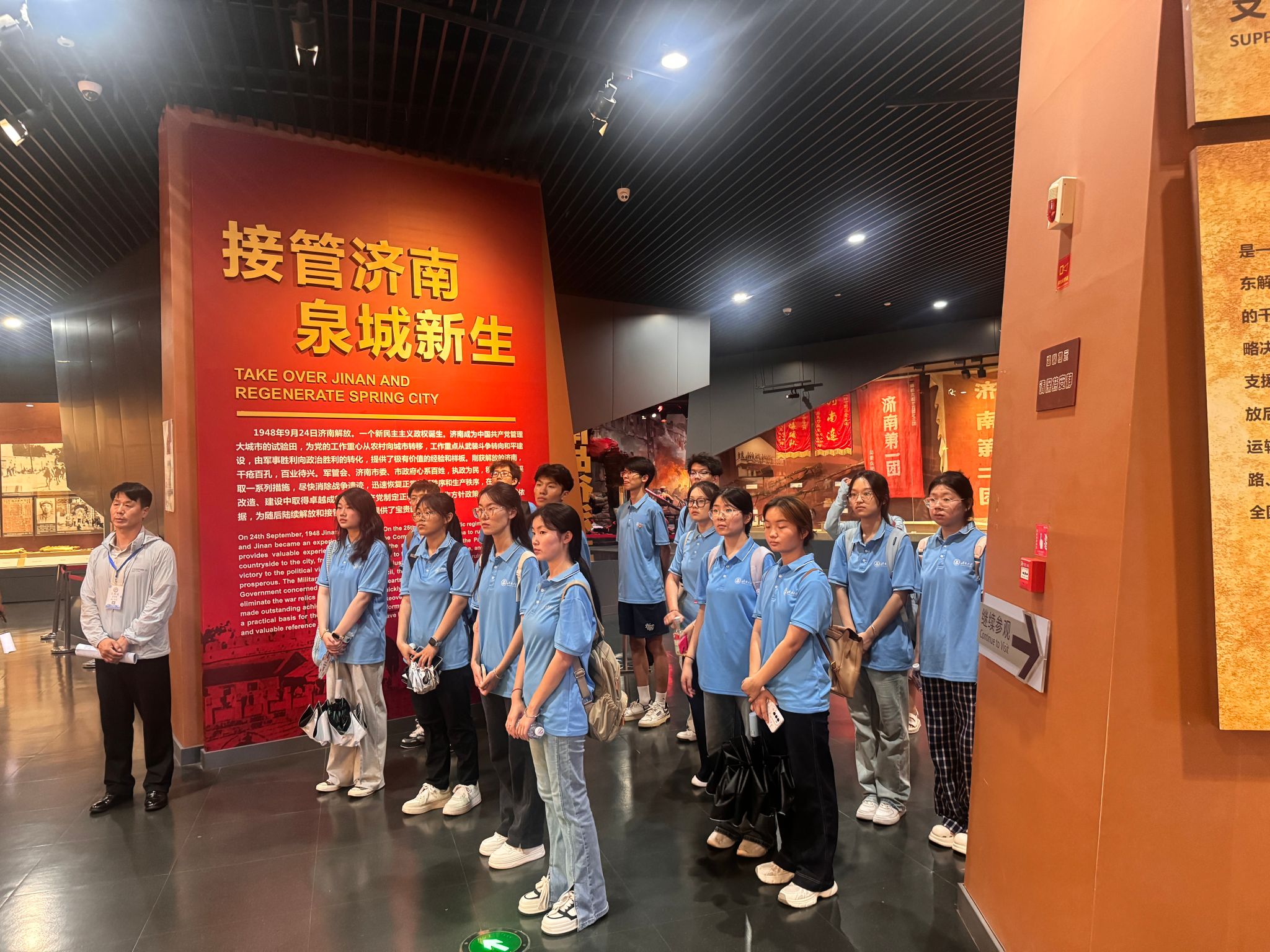活动当天大家怀着崇敬之心步入展馆,在讲解员的带领下开启一段深刻的历史回溯。馆内陈列的泛黄战地照片、锈迹斑斑的武器装备、详实的文献资料,生动还原济南战役的壮阔历程。从战前部署的运筹帷幄到战役打响的浴血奋战,从军民同心的鱼水情深到胜利会师的历史时刻,每一个细节都让队员们深切感受到革命先烈为民族解放事业付出的巨大牺牲,也让“敢打必胜”的战役精神在青年心中愈发清晰。