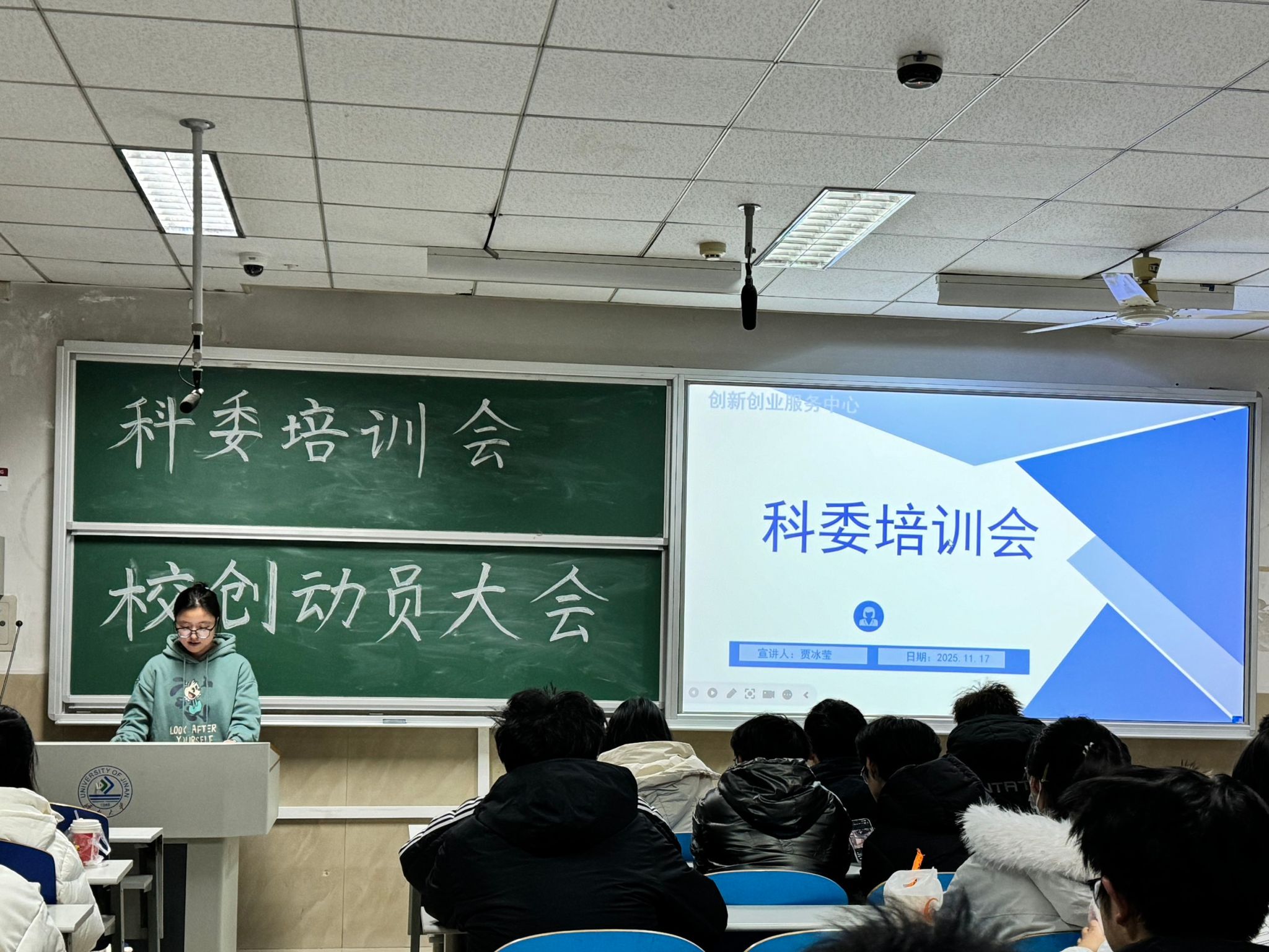 学生会创新创业服务中心科创创新部贾冰莹以创新创业服务中心介绍、科委职责、科委工作流程、校创注意事项四个方面展开会议。