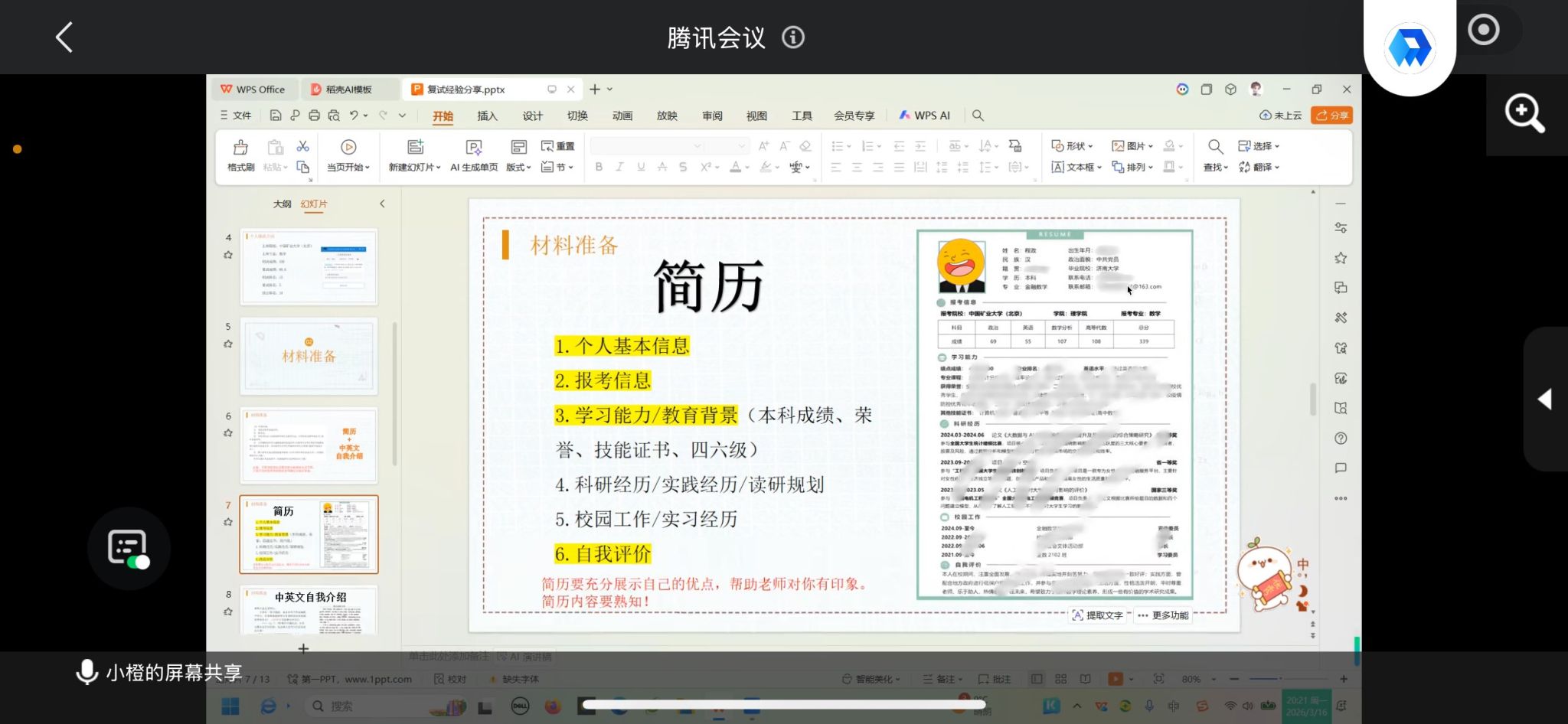 分享会上,庞诗卉首先聚焦面试核心能力,从心态、自我介绍、抽题应答等方面展开细致讲解,她强调答题需沉稳从容,遇熟题不躁、遇生题不慌,自我介绍需打磨中英文双版本,严格控制2-3分钟时长,突出个人优势并引导提问方向,针对时政类、日常类及英文专业类问题,她也给出灵活应对的方法,同时提醒大家面试时要保持大方自信,主动与老师交流互动。紧接着,王晓雨结合自身逆袭上岸的实战经历,从英语、笔试、面试三大模块分享备考方案,她以自身排名靠后却成功上岸的经历印证复试重要性,建议考生强化英语自我介绍背诵,尽早开展笔试复习并保持备考强度,借助模拟训练提升面试表现,同时梳理科研获奖经历、合理制定每日学习计划。最后,程政围绕复试全流程筹备与临场礼仪进行补充讲解,提醒大家密切关注院校官网通知,提前完成材料盖章等准备工作,精心制作涵盖学习与实践经历的个人简历,扎实复习专业课程,面试时注重礼仪细节、灵活应对未知问题,同时提前规划复试住宿,并鼓励排名靠后的同学坚定信心、全力冲刺逆袭。