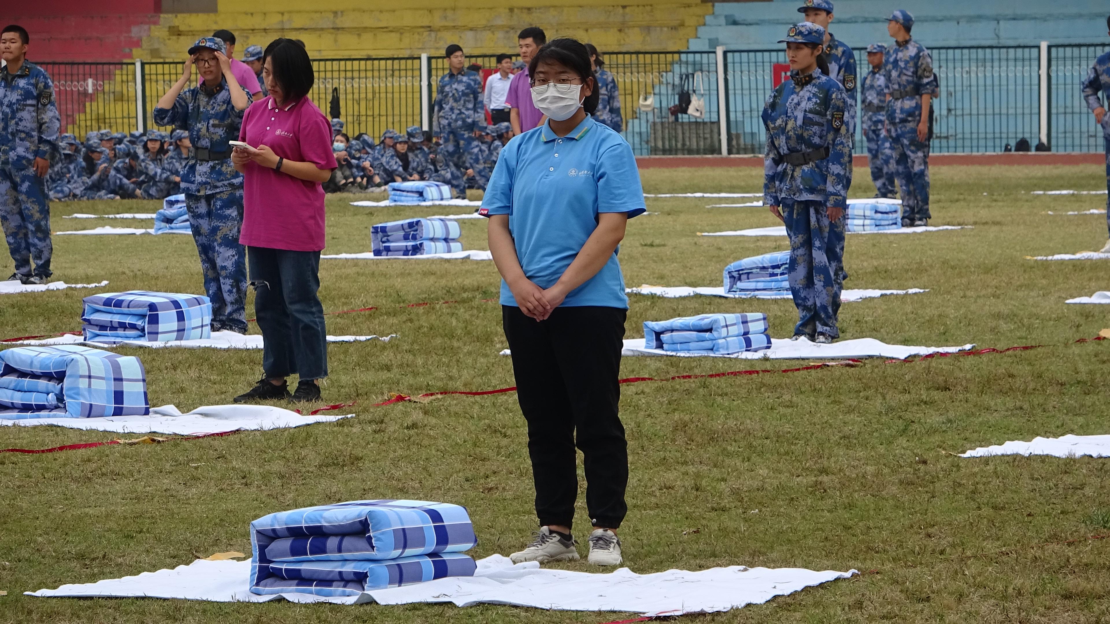 的选手们都摩拳擦掌,跃跃欲试,准备在此次比赛中一展风采。随着主持人一声令下,比赛正式开始,同学们也立即进入状态,迅速蹲下,铺平、压实、翻折、抠角、捏线,熟练地叠起被子,有的甚至以纸板、筷子等予以辅助。在短短的的5分钟比赛时间里,同学们的被子从最初的“奇形怪状”变成了统一的豆腐块,方方正正、整整齐齐,棱角分明。