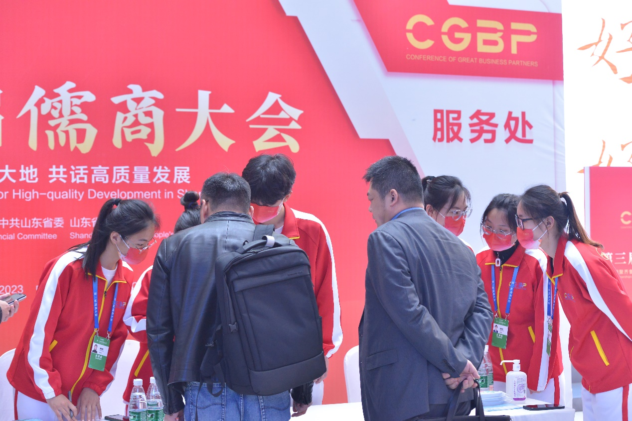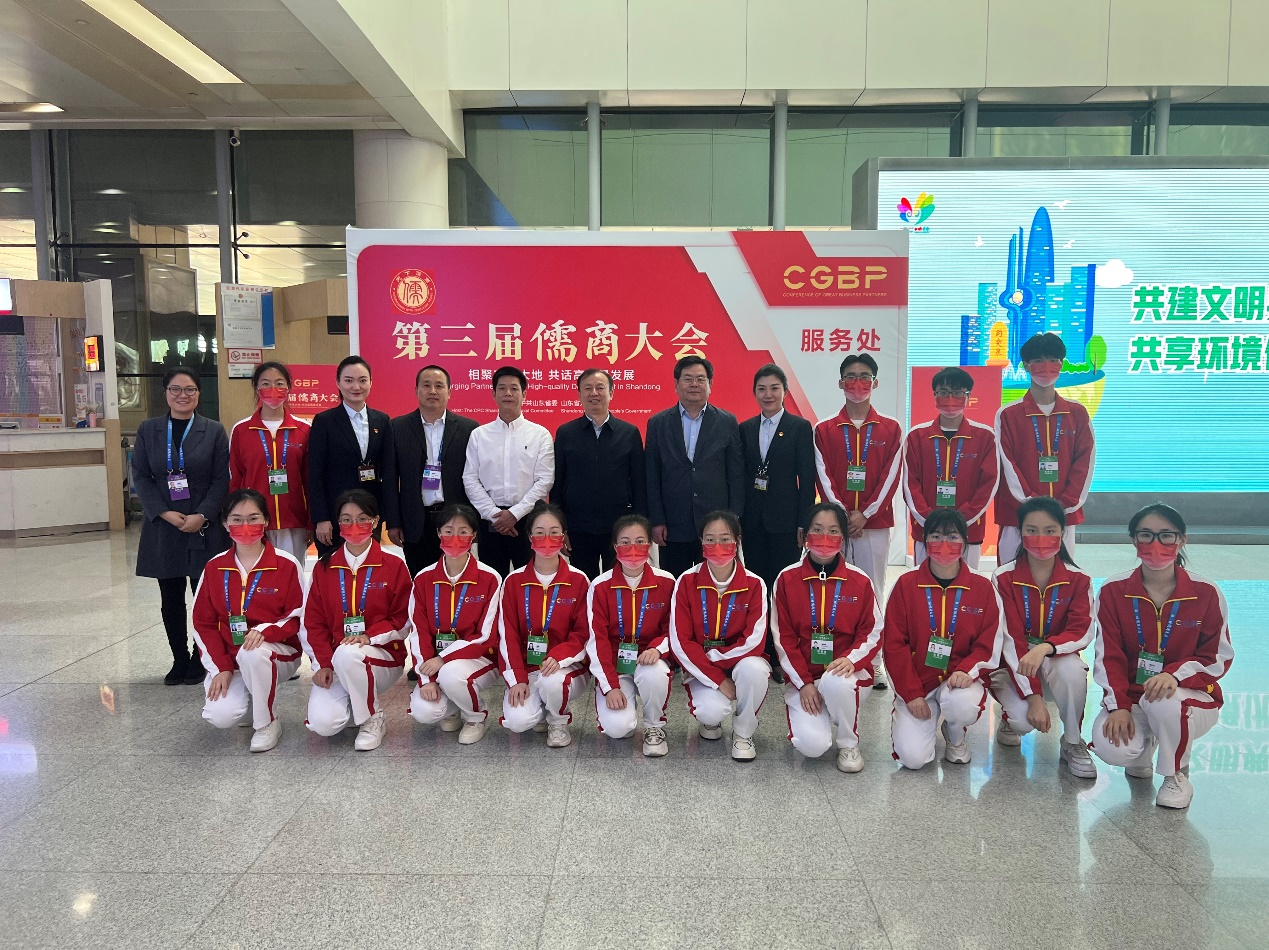 积极响应校团委号召,遴选14优秀志愿者参与儒商大会志愿活动,在多个大类服务岗位和服务点位为大会提供接站送站、接待指引、会务保障等服务。