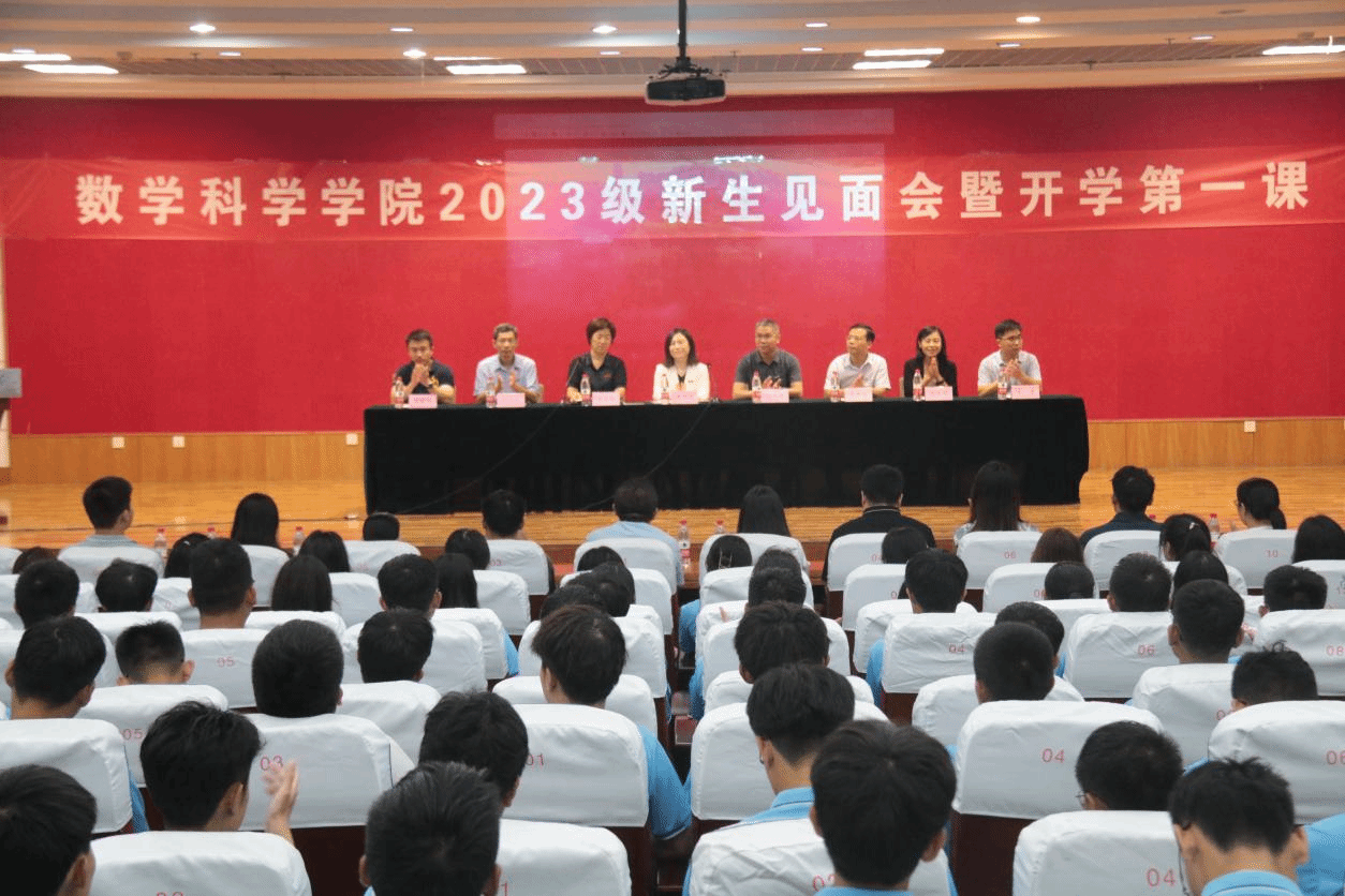 2023级新生见面会暨开学第一课在第二学术报告厅举行。学院党委书记崔英静、院长孙元功、副院长王洪凯、副院长靳绍礼、数学与应用数学系主任陈文娟、金融数学系主任祁晓光、科学计算与数据分析系主任王涛出席会议。会议由学院党委副书记、副院长张沂红主持,学院2023级新生班主任、全体辅导员、以及全体2023级研究生和本科新生参加会议。